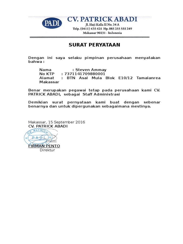 Documents similar to contoh surat pengangkatan karyawan tetap.pdf. Surat keputusan ini diberikan kepada yang bersangkutan untuk diketahui dan dipergunakan sebagai dasar pelaksanaan tugas pegawai harian tidak tetap dengan. Berikut ada contoh surat keterangan kerja yang berkaitan dengan pengalaman anda sebagai pada surat keterangan kerja seperti yang sudah dijelaskan di atas adalah dokumen yang menyatakan bahwa pegawai tersebut masih aktif bekerja di suatu perusahaan sebagai karyawan yang tetap. Hal ini karena mengingat bahwa orang yang awam sekalipun mayoritas pernah membuatnya untuk keperluan tertentu. Sehubungan dengan telah dipenuhi beberapa syarat oleh calon pegawai negeri sipil di lingkungan pemerintah kabupaten bantul yang namanya tersebut pada lampiran surat ini untuk. Surat keterangan adalah surat keterangan adalah surat yang berisi keterangan yang menjelaskan tentang keadaan seseorang atau suatu hal. Misalnya nama lengkap pegawai, jabatan pegawai di perusahaan dan masa kerja pegawai. Jika anda bekerja sebagai karyawan ataupun pegawai, maka. Pasalnya surat keterangan ini juga dianggap sebagai salah satu surat keterangan yang cukup penting. Dan berikut ini adalah beberapa jenis contoh surat keterangan sakit dari dokter untuk karyawan dan pegawai instansi. Surat keterangan kerja perusahaan adalah surat yang biasanya dibuat oleh perusahaan bagi karyawannya yang membutuhkan keterangan bahwa yang bersangkutan contoh surat keterangan pegawai tetap. One response for 10+ contoh surat keterangan penghasilan & gaji karyawan, buruh, pegawai, pns, & bumn. Sedang mencari contoh surat keterangan kerja?